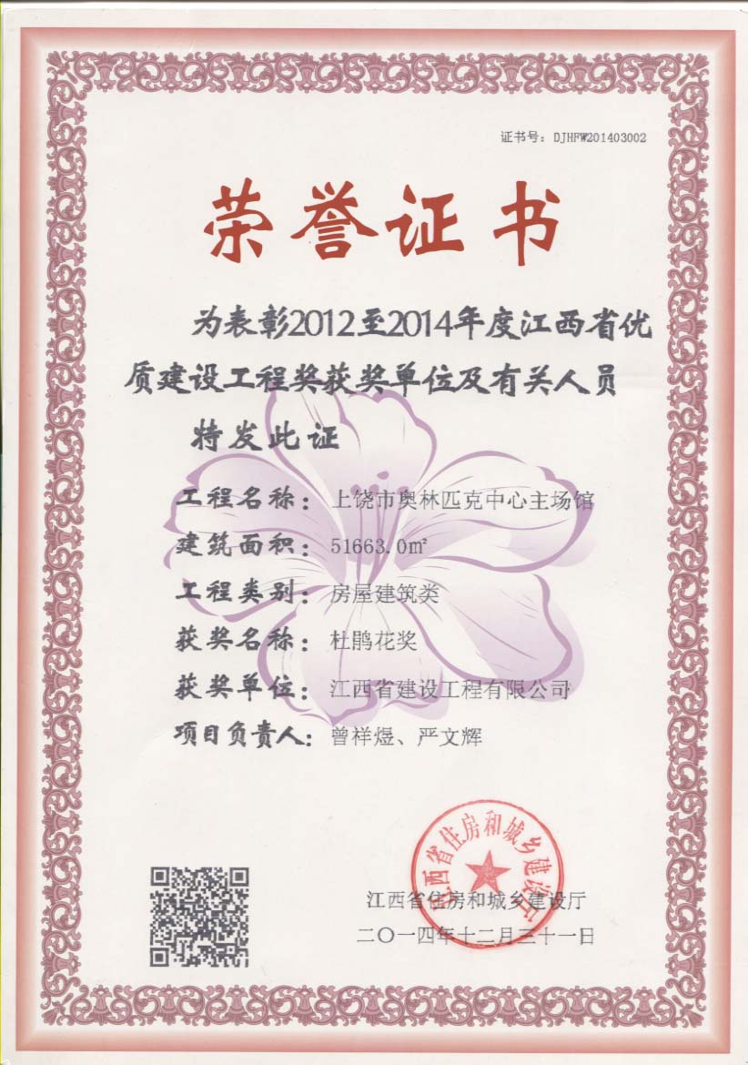 上饒奧體中心主場館項目榮獲“江西省優質工程杜鵑花獎”