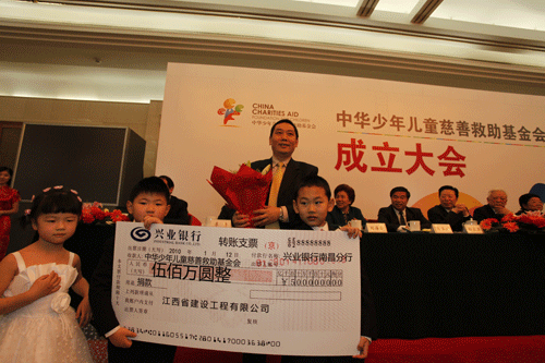 中華少年兒童慈善救助基金會(以下簡稱“兒慈會”)2010年1月12日在北京人民大會堂正式成立。中共中央政治局常委、國務院副總理李克強在為基金會成立發(fā)來的賀信中說:“慈善救助是一項崇高的事業(yè),是對社會保障的重要補充。謹對基金會的成立表示祝賀,對大家矢志從事少年兒童事業(yè)表示由衷的敬意。希望并相信你們會在各方支持下,發(fā)揮優(yōu)勢,搭建平臺,幫助更多有特殊困難的少年兒童和他們的同齡人,一起在同一片藍天下健康成長。”江西省建設工程有限公司董事長宗贛生到會并捐贈人民幣500萬元設立"自立奮進獎",宗贛生表示,以后會根據(jù)企業(yè)發(fā)展狀況捐款額逐年遞增,對貧困學生以及教師進行資助和獎勵。